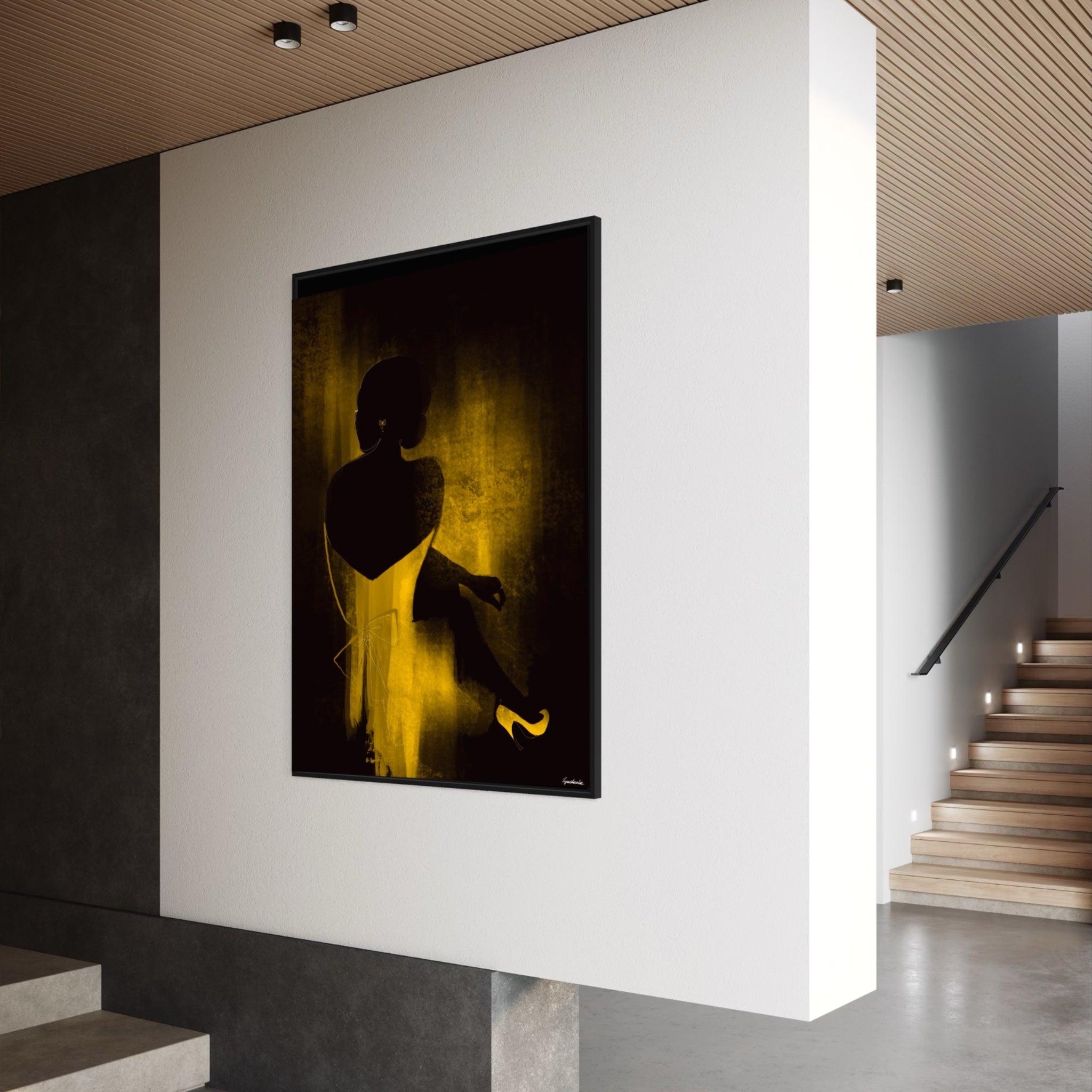 Eclipse of Elegance captures a moment of serene introspection, bathed in deep shades of black and warm yellow accents. The woman, looking away into the shadows, exudes quiet sophistication, grace, and calm. Her elegant pose and flowing silhouette convey a timeless femininity, perfectly suited for collectors, interior designers, and curated luxury spaces.