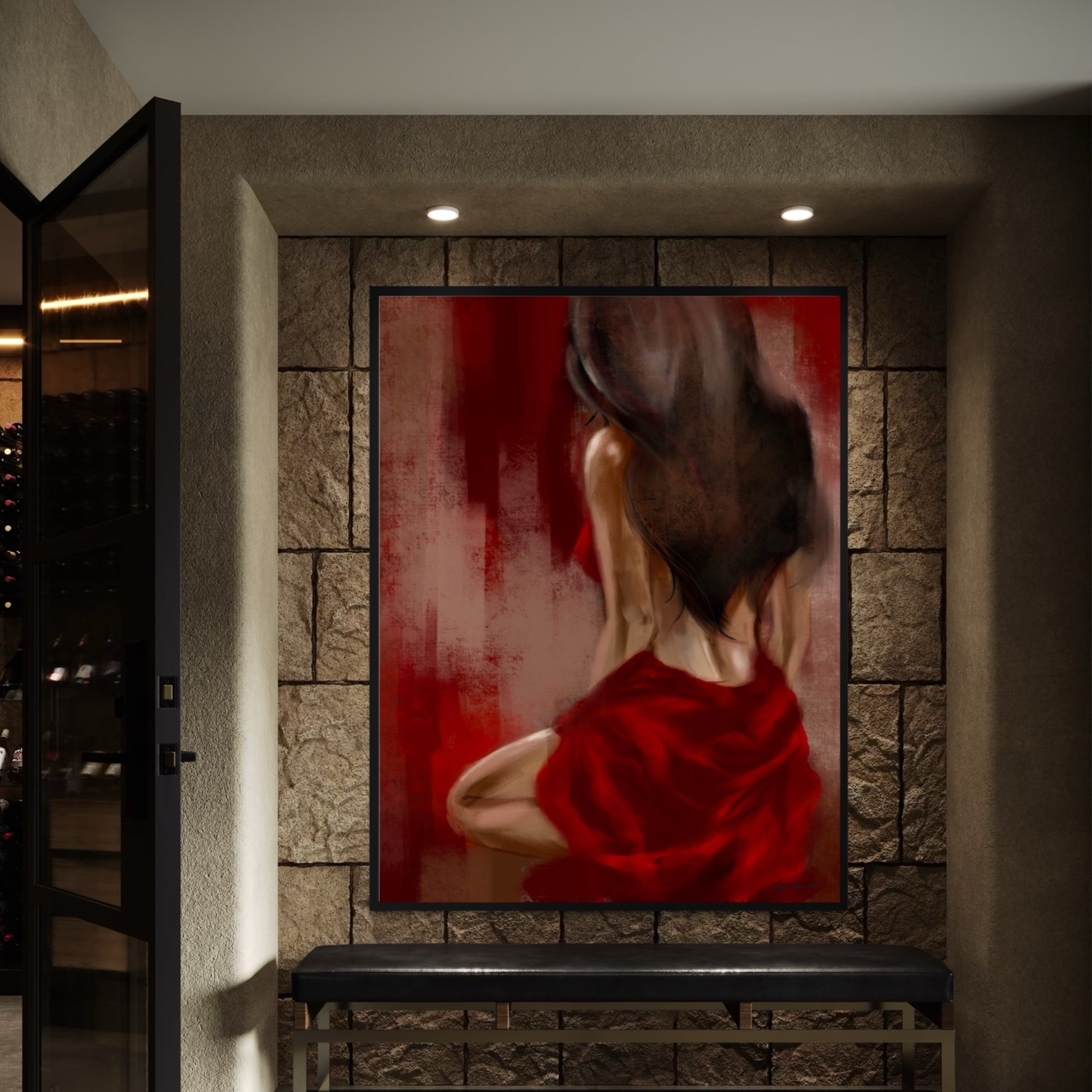 This work speaks to the elegance found in pause — when silence holds its own power. With its balance of passion and restraint, The Stillness is a statement piece for luxury interiors, boutique hotels, galleries, and private collections seeking art that embodies timeless femininity.