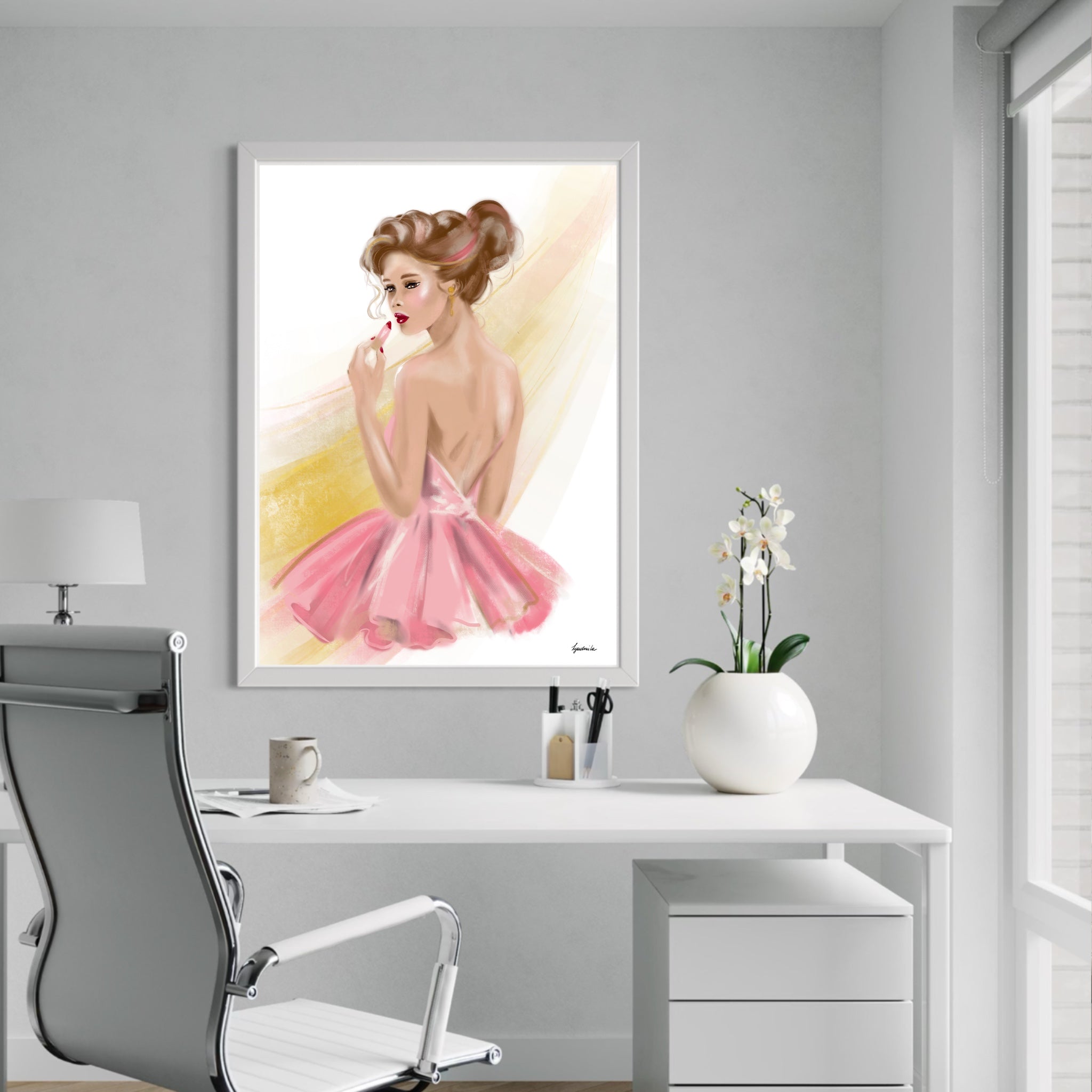 Created with layered digital brushwork that echoes ink and acrylic texture, this portrait belongs to the Art About Her collection by GracefulBrush. The soft pinks and gold undertones capture movement and emotion, blending fashion-inspired expression with contemporary elegance.