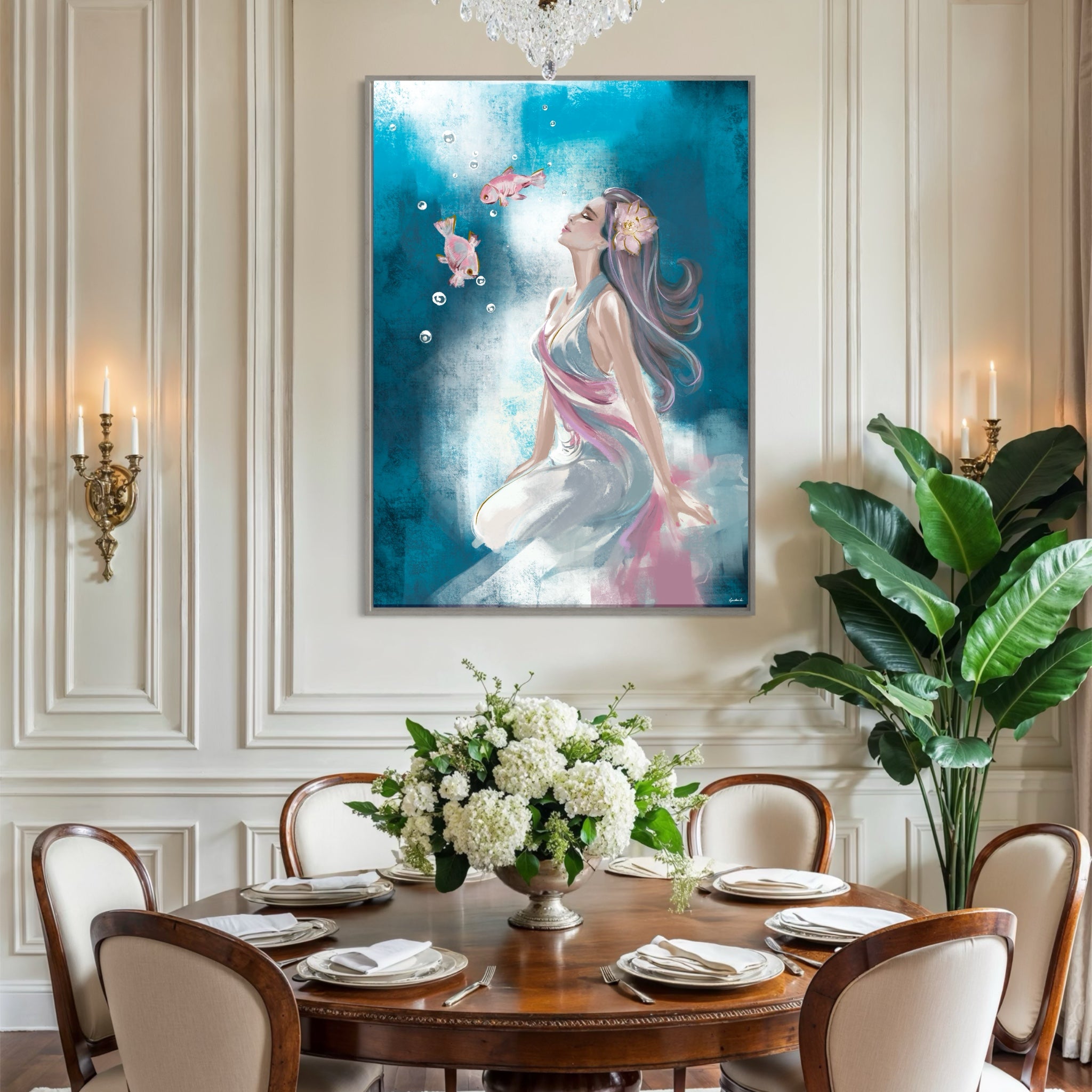 Ocean of Grace captures the stillness and strength of a feminine figure immersed in a dreamlike world of flowing water and color. Draped in delicate tones of blush and white, she rises upward in serenity, her posture an offering of surrender and resilience. Around her, koi fish drift in quiet harmony — symbols of transformation, perseverance, and beauty.