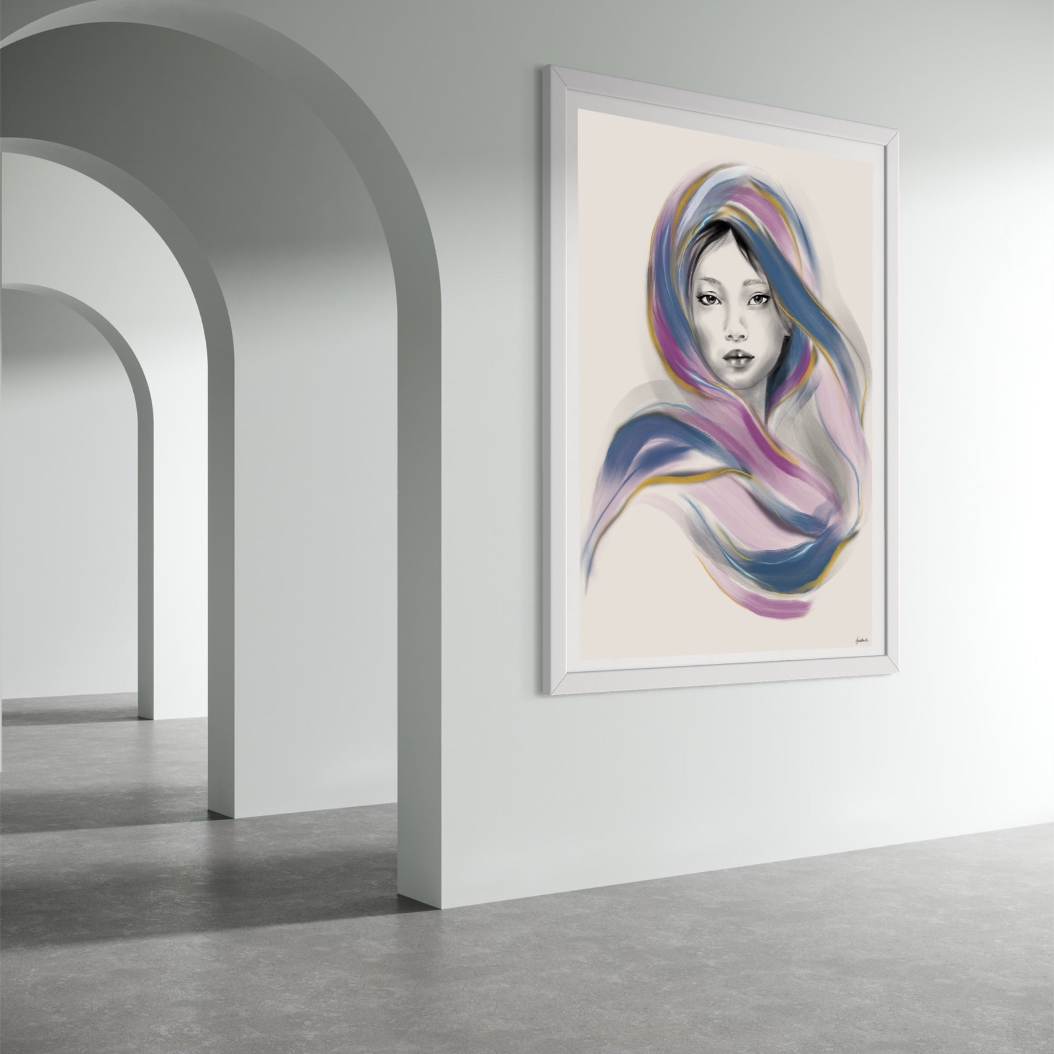 Draped in Light is a portrait of quiet strength and luminous femininity. A grayscale face emerges from flowing drapery rendered in deep indigo, magenta, and soft lilac — brushstrokes that move like silk caught in motion. The interplay of vibrant color and delicate monochrome creates a harmony of contrast: bold yet tender, modern yet timeless.